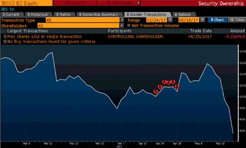 No mês passado, enquanto confessavam seus crimes ao Supremo Tribunal Federal, os irmãos Joesley e Wesley Batista venderam quase 32 milhões de ações da companhia, um total de R$ 328 milhões. (As vendas estão em vermelho no gráfico a seguir).