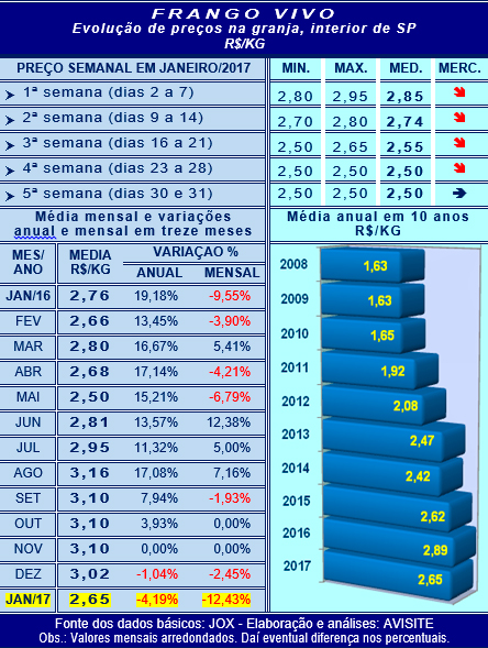 Campinas, 01 de Fevereiro de 2017 - Em 100% dos últimos cinco anos, o frango vivo (base: preço ao produtor no interior paulista) encerrou o primeiro mês do ano valendo menos que na abertura do exercício.